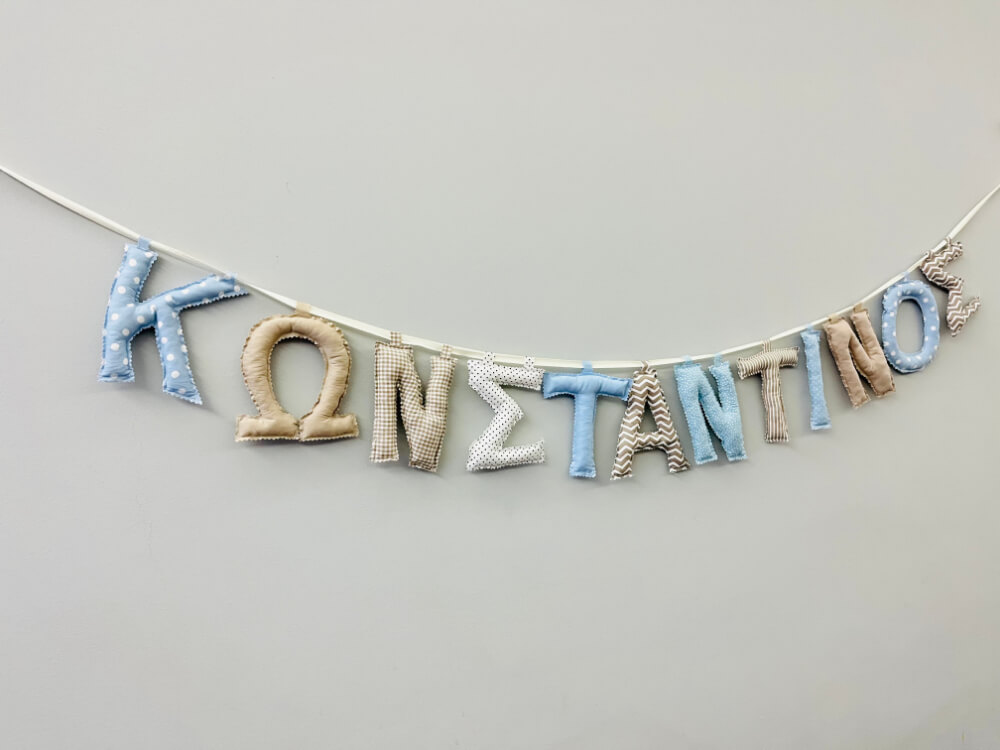 Χειροποίητο προσωποποιημένο name banner. Αναγράφεται το όνομα του παιδιού. Κάθε γράμμα κατασκευάζεται με προσοχή στη λεπτομέρεια, δημιουργώντας ένα ξεχωριστό διακοσμητικό που προσθέτει χρώμα, ζεστασιά και στυλ στο παιδικό δωμάτιο. Ένα απλό αλλά ταυτόχρονα εντυπωσιακό δώρο για πληθώρα περιστάσεων.