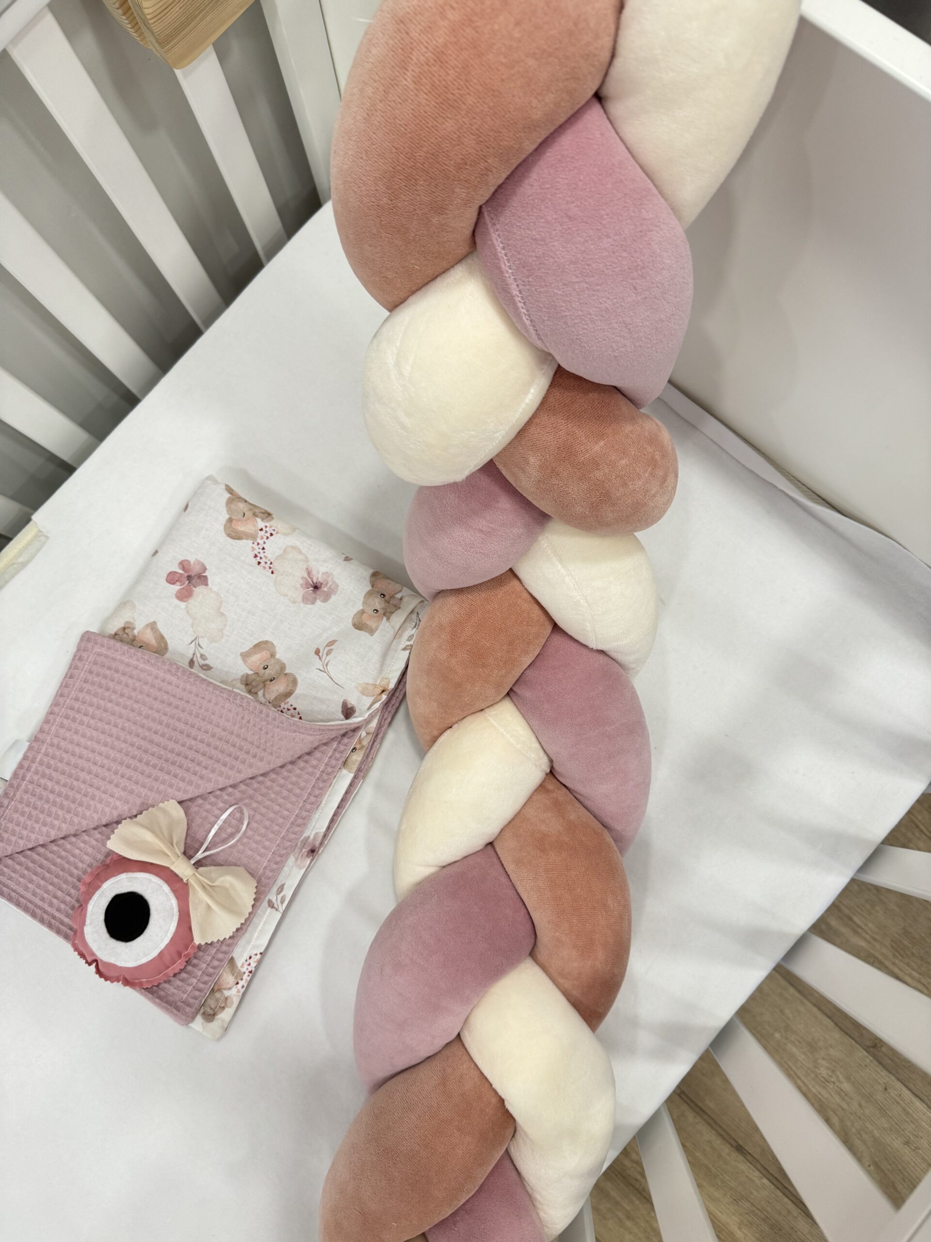 Χειροποίητη πάντα κούνιας πλεξούδα για το κρεβατάκι του μωρού σας, απαλή σαν το χάδι της μαμάς, από υφάσματα υψηλής ποιότητας. Υπάρχει δυνατότητα ειδικών διαστάσεων και επιλογής χρωμάτων κατόπιν επικοινωνίας με το κατάστημα.