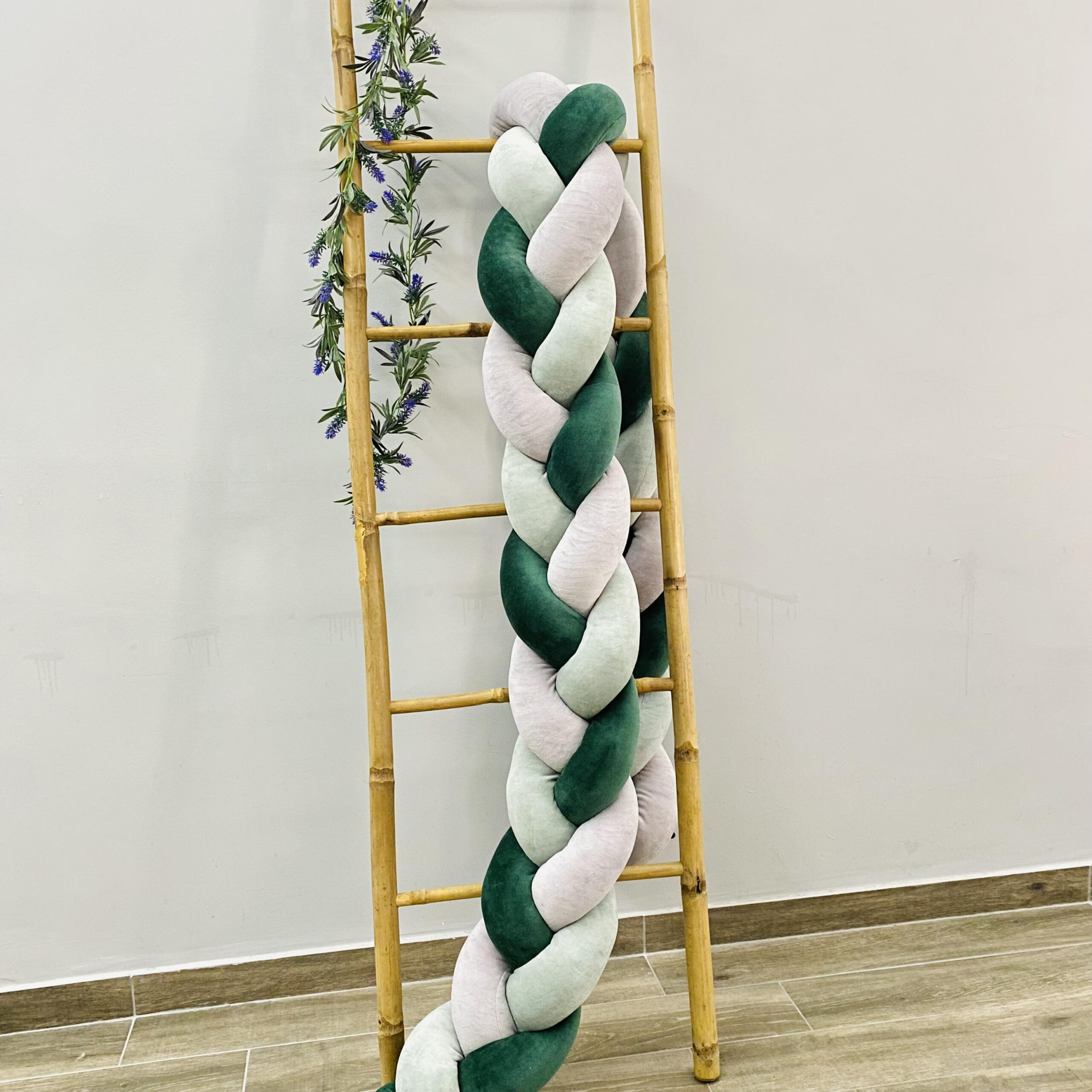 Χειροποίητη πάντα κούνιας πλεξούδα κυπαρισσί – ευκάλυπτος – γκρι για το κρεβατάκι του μωρού σας, απαλή σαν το χάδι της μαμάς, από υφάσματα υψηλής ποιότητας. Υπάρχει δυνατότητα ειδικών διαστάσεων και επιλογής χρωμάτων κατόπιν επικοινωνίας με το κατάστημα.