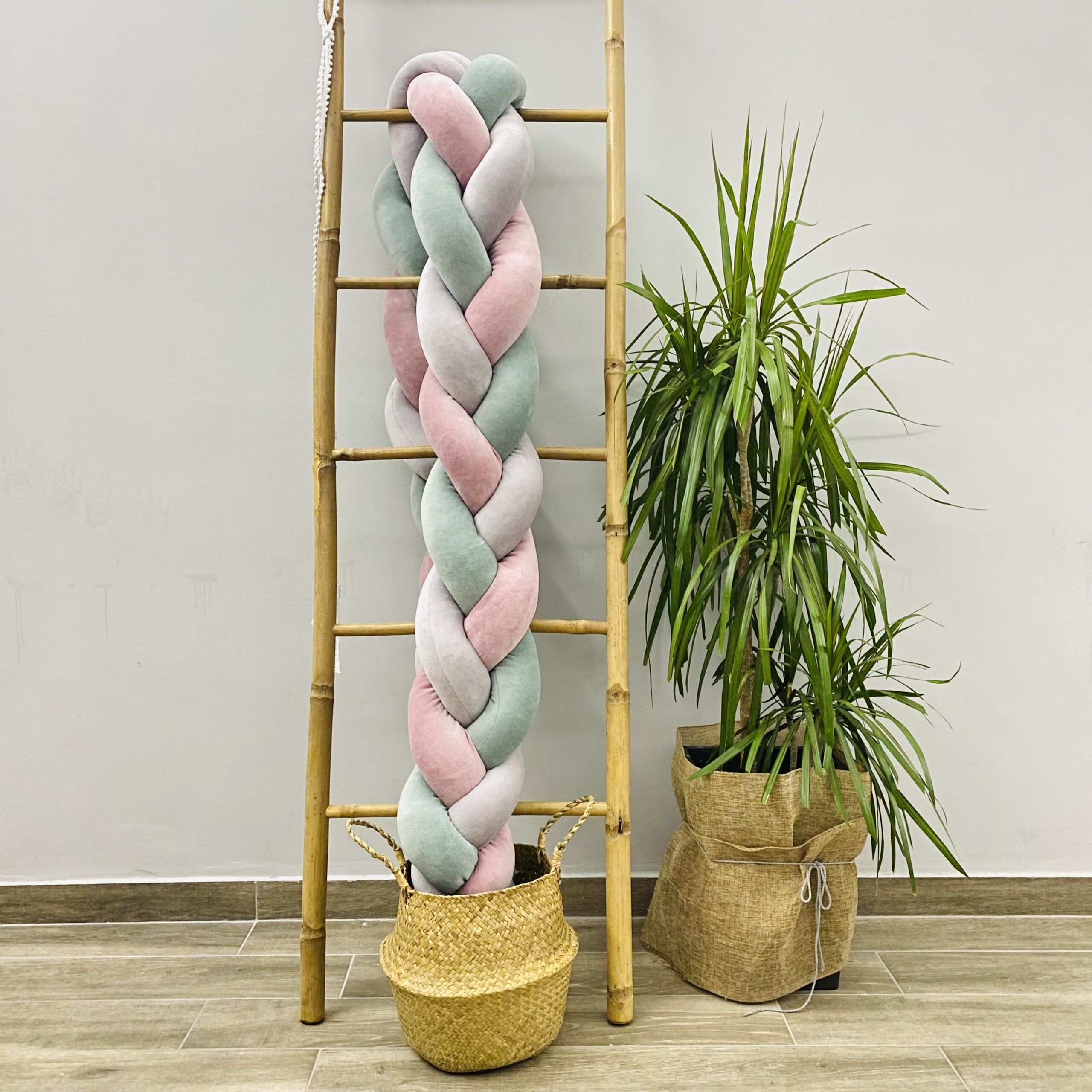 Χειροποίητη πάντα κούνιας πλεξούδα ροζ – ευκάλυπτος – γκρι για το κρεβατάκι του μωρού σας, απαλή σαν το χάδι της μαμάς, από υφάσματα υψηλής ποιότητας. Υπάρχει δυνατότητα ειδικών διαστάσεων και επιλογής χρωμάτων κατόπιν επικοινωνίας με το κατάστημα.
