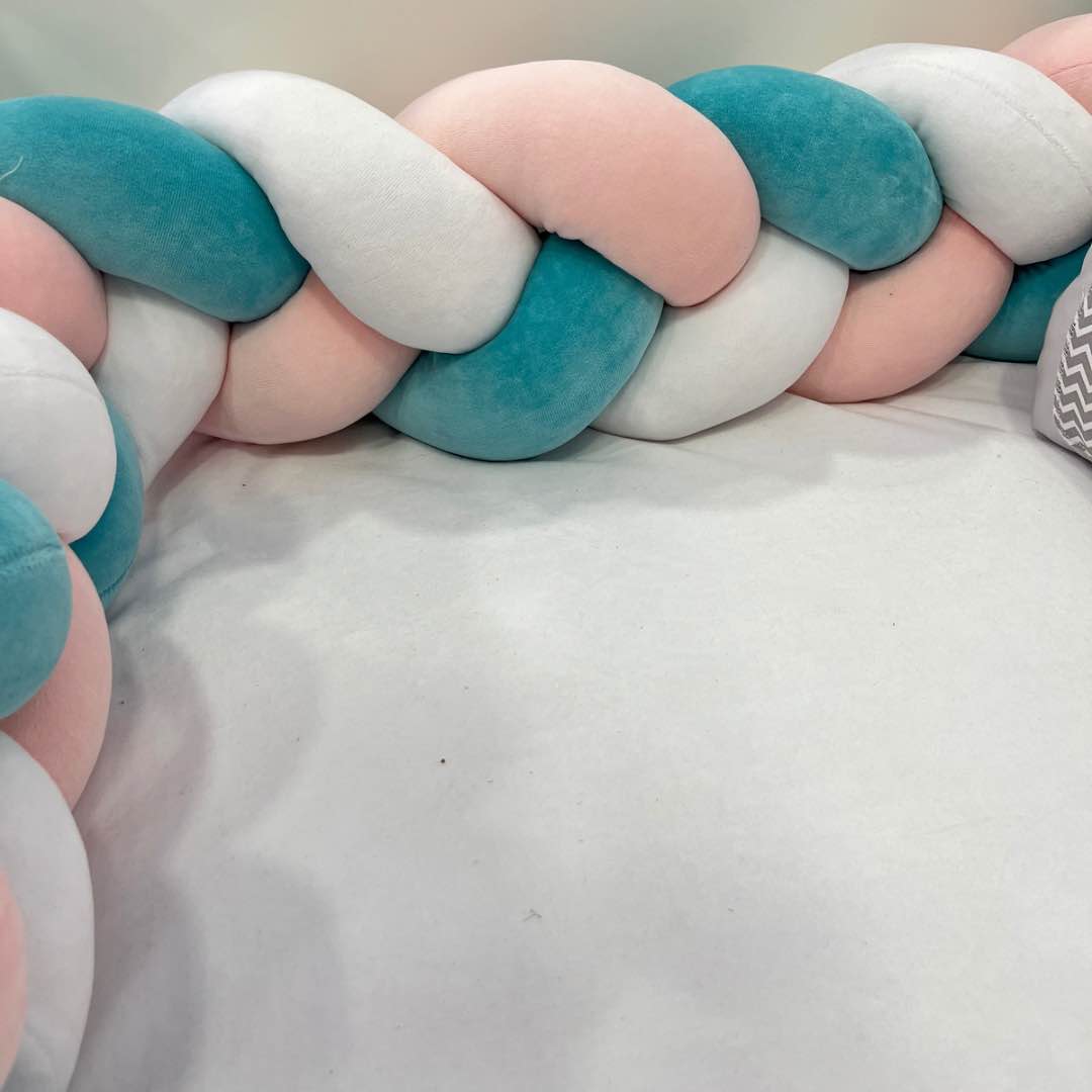 Χειροποίητη πάντα κούνιας πλεξούδα τιρκουάζ ροζ λευκό για το κρεβατάκι του μωρού σας, απαλή σαν το χάδι της μαμάς, από υφάσματα υψηλής ποιότητας. Υπάρχει δυνατότητα ειδικών διαστάσεων και επιλογής χρωμάτων κατόπιν επικοινωνίας με το κατάστημα.