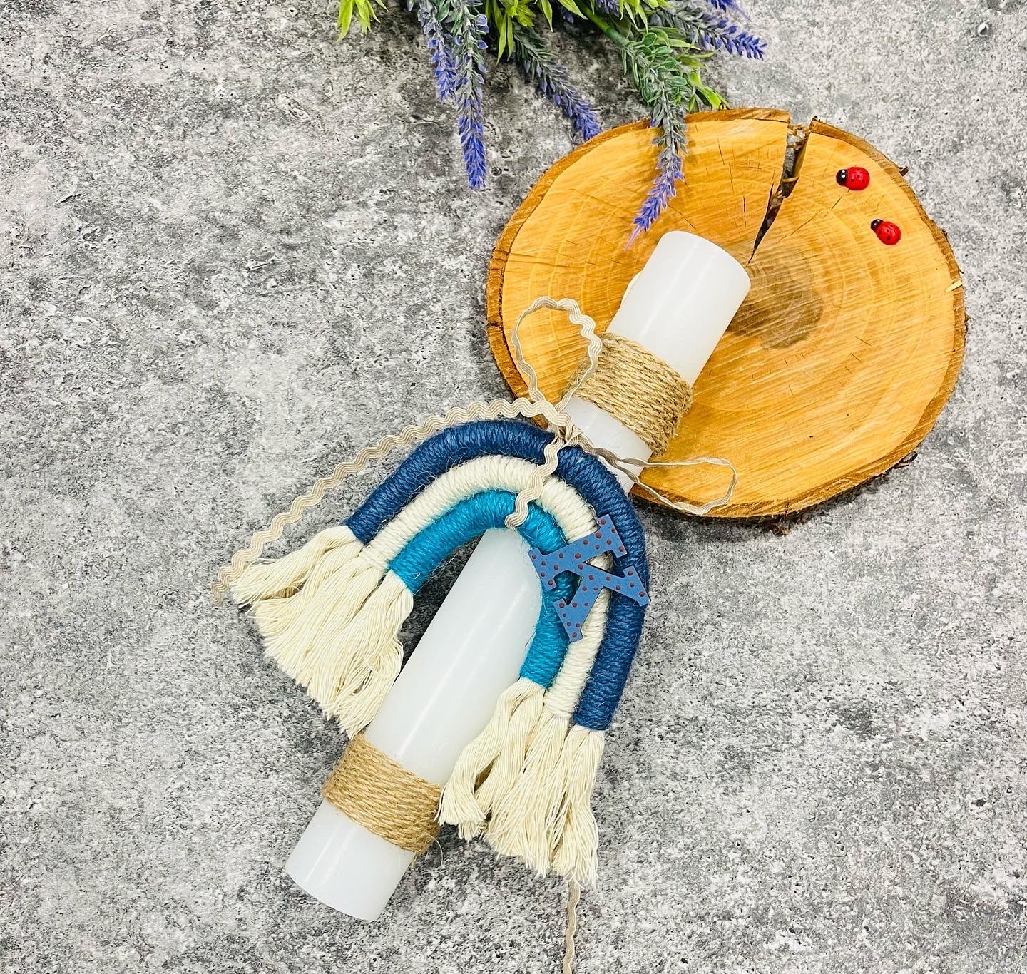 Πασχαλινή αρωματική λαμπάδα με μακραμέ ουράνιο τόξο.Στα σχόλια σημειώστε το αρχίκο γράμμα που θέλετε να αναγράφεται.