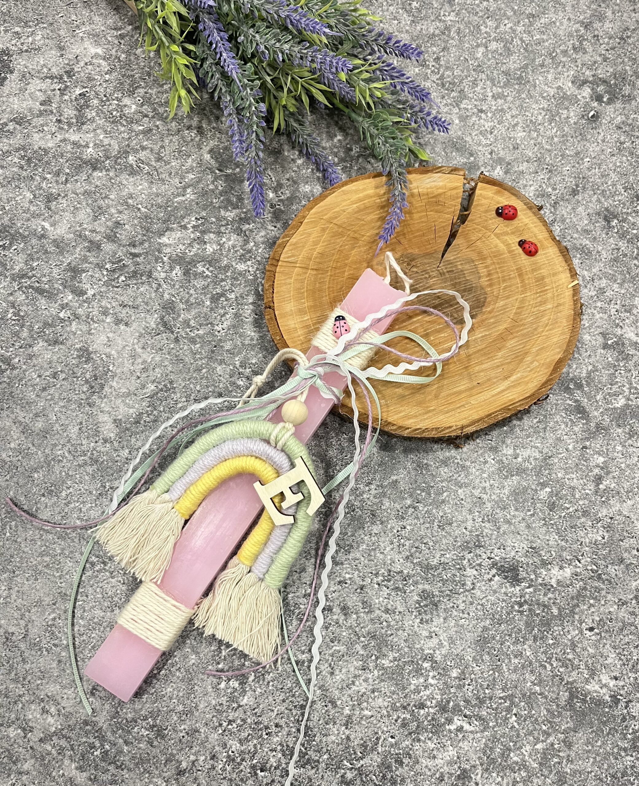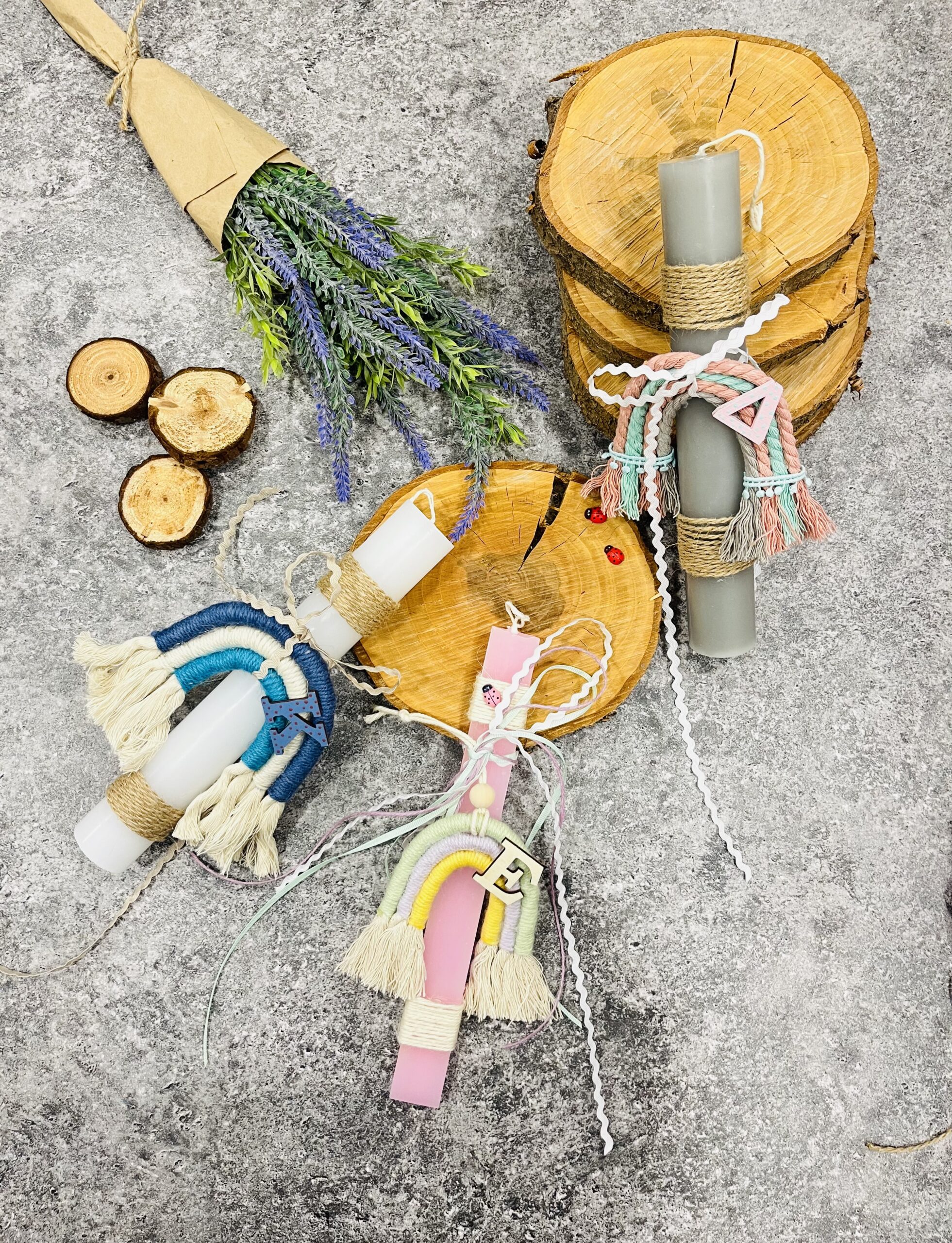 Πασχαλινή αρωματική λαμπάδα με μακραμέ ουράνιο τόξο.Στα σχόλια σημειώστε το αρχίκο γράμμα που θέλετε να αναγράφεται.