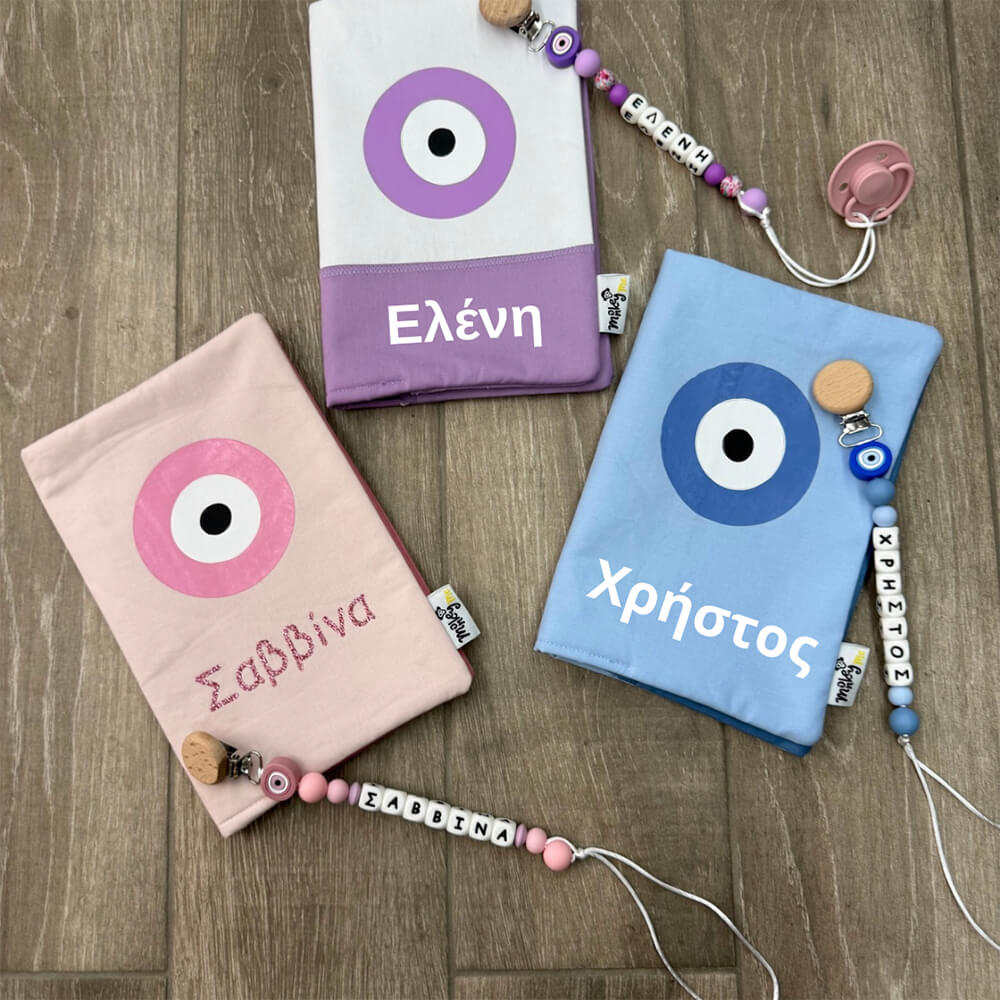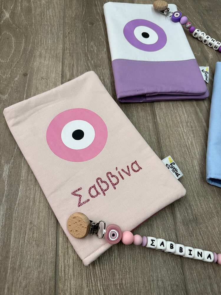 Θήκη Βιβλιαρίου Υγείας με Μάτι Γούρι, και το όνομα του παιδιού.