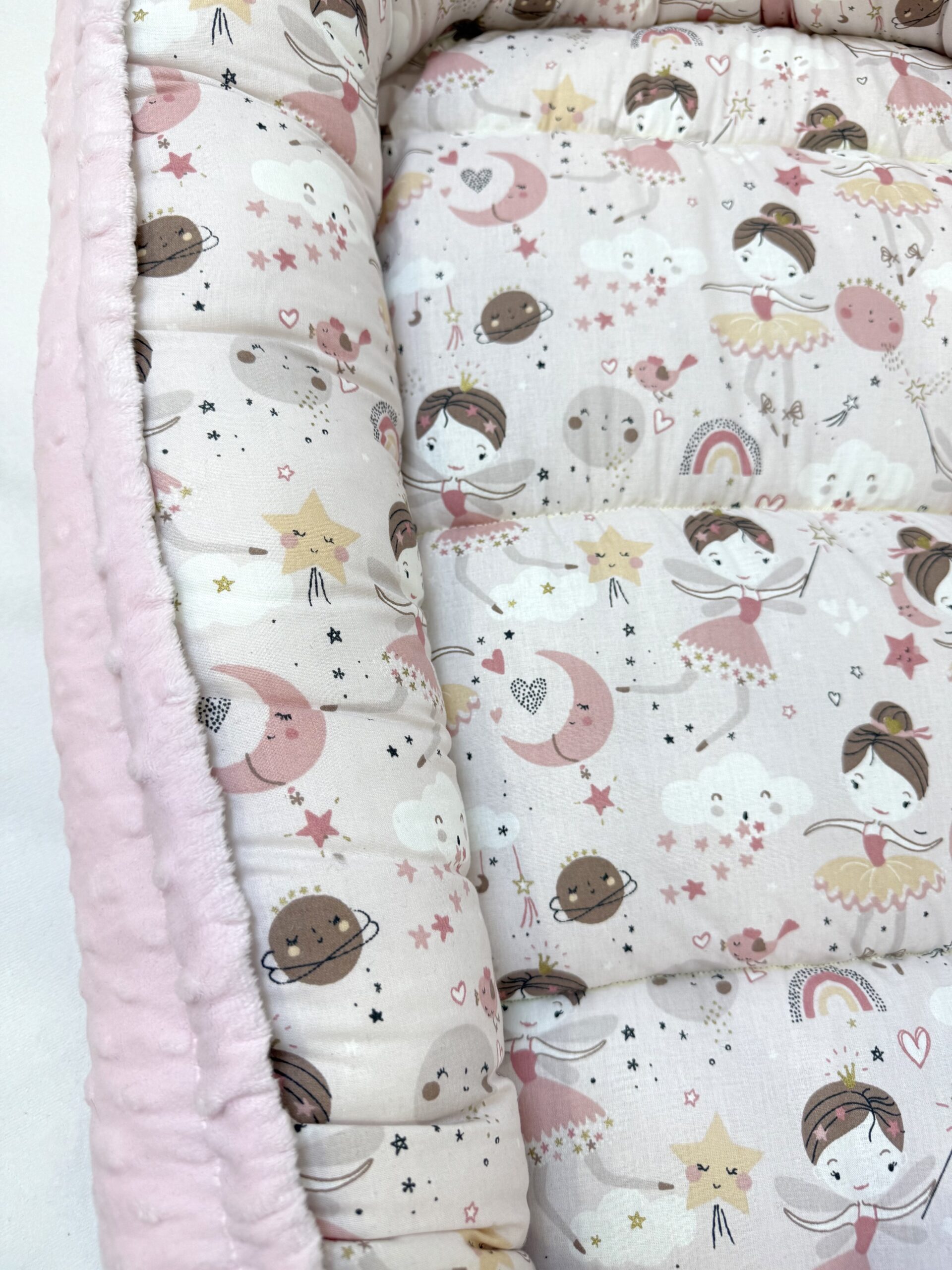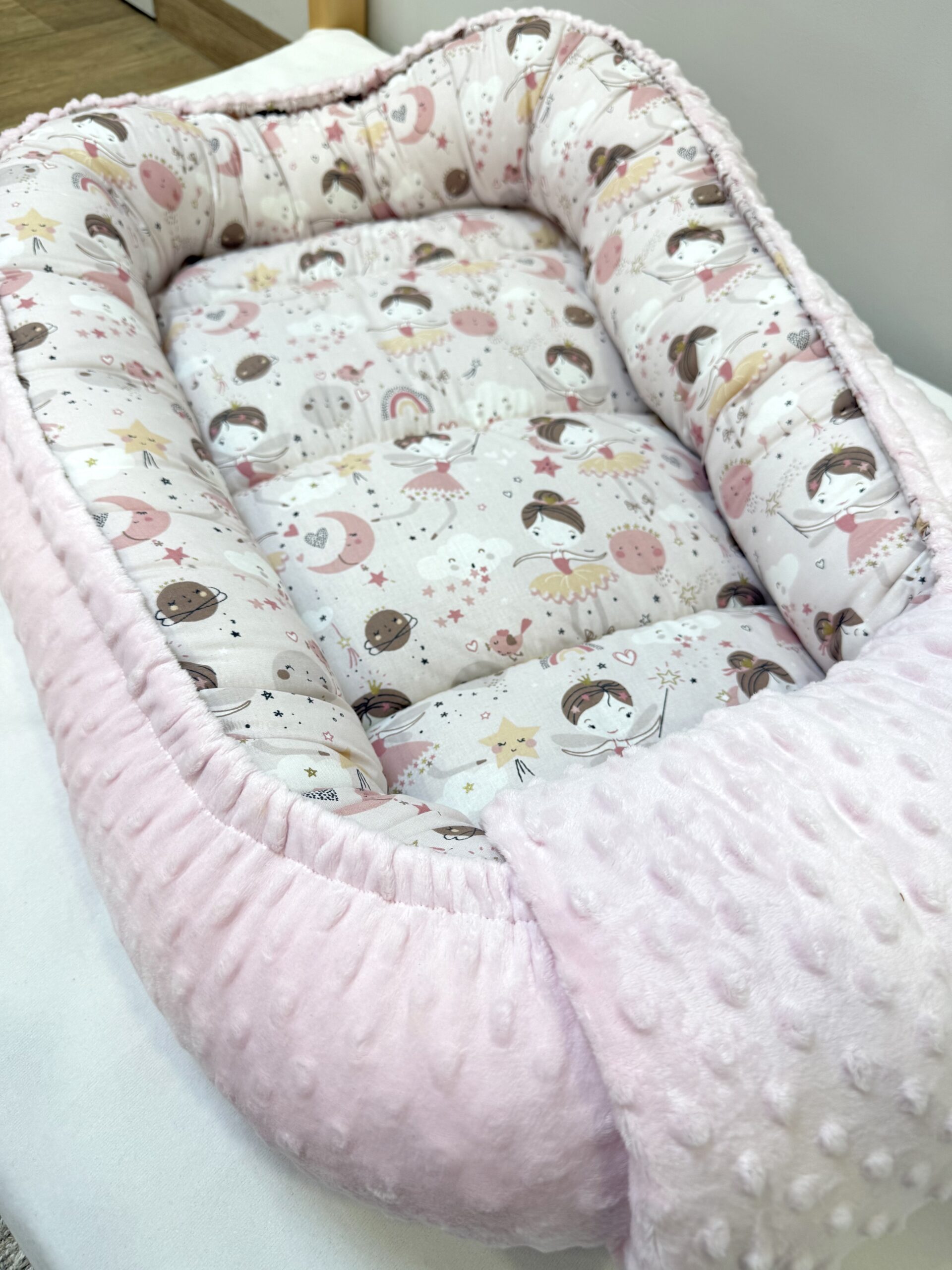 Βρεφική φωλιά υποαλλεργική με σχέδιο Pink Ballerina. Προστατεύει το μωράκι μας από τα χτυπήματα και του δίνει ασφάλεια για την μετάβαση απο την κοιλίτσα της μαμάς.
