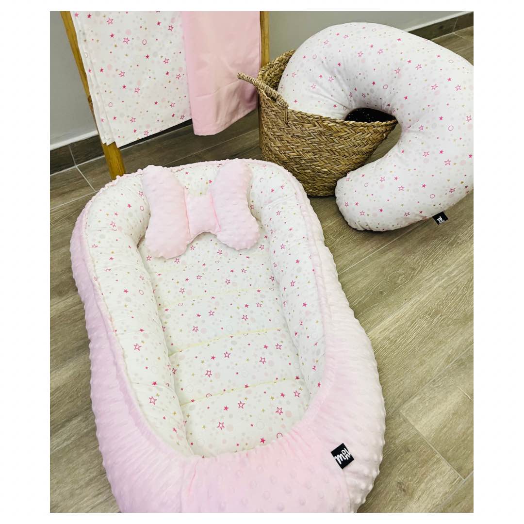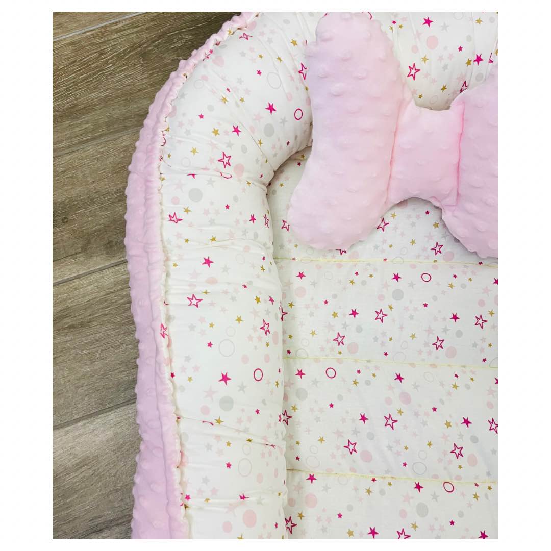 Βρεφική φωλιά ροζ με αστεράκια. Προστατεύει το μωράκι μας από τα χτυπήματα και του δίνει ασφάλεια για την μετάβαση απο την κοιλίτσα της μαμάς.