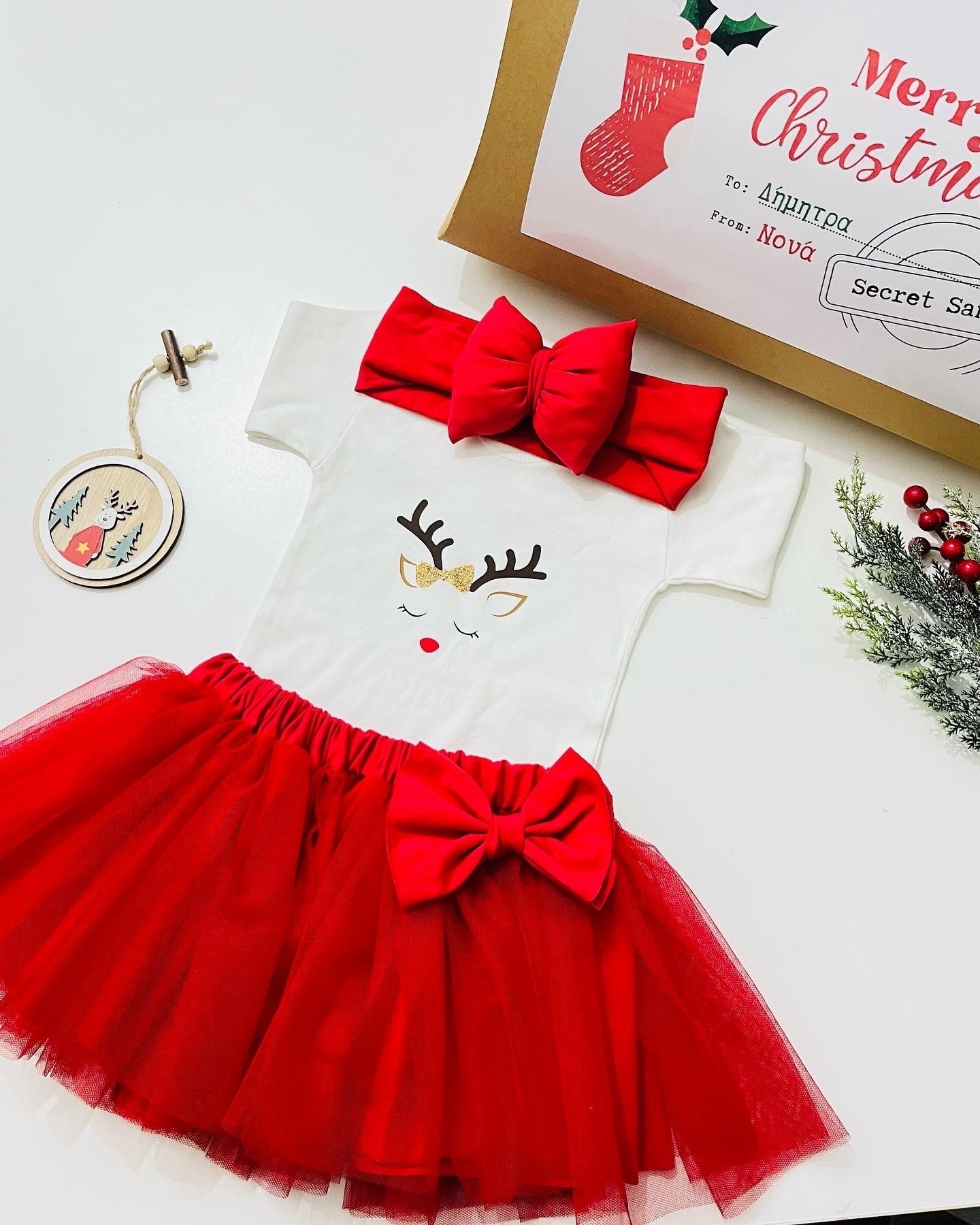 Χριστουγεννιάτικη Δώρο – Τσάντα για βρέφος κορίτσι! Με σχέδιο ελαφάκι πάνω στο φορμάκι. Περιλαμβάνει κορδέλα για τα μαλλιά, καλτσάκια και φορμάκι. Όλα αυτά μέσα σε ένα premium craft bag που δίνει έναν αέρα ποιότητας, και χαρίζει καλαισθησία στην περίσταση. Παρέχουμε την δυνατότητα να προσθέσετε επάνω το δικό σας μήνυμα!